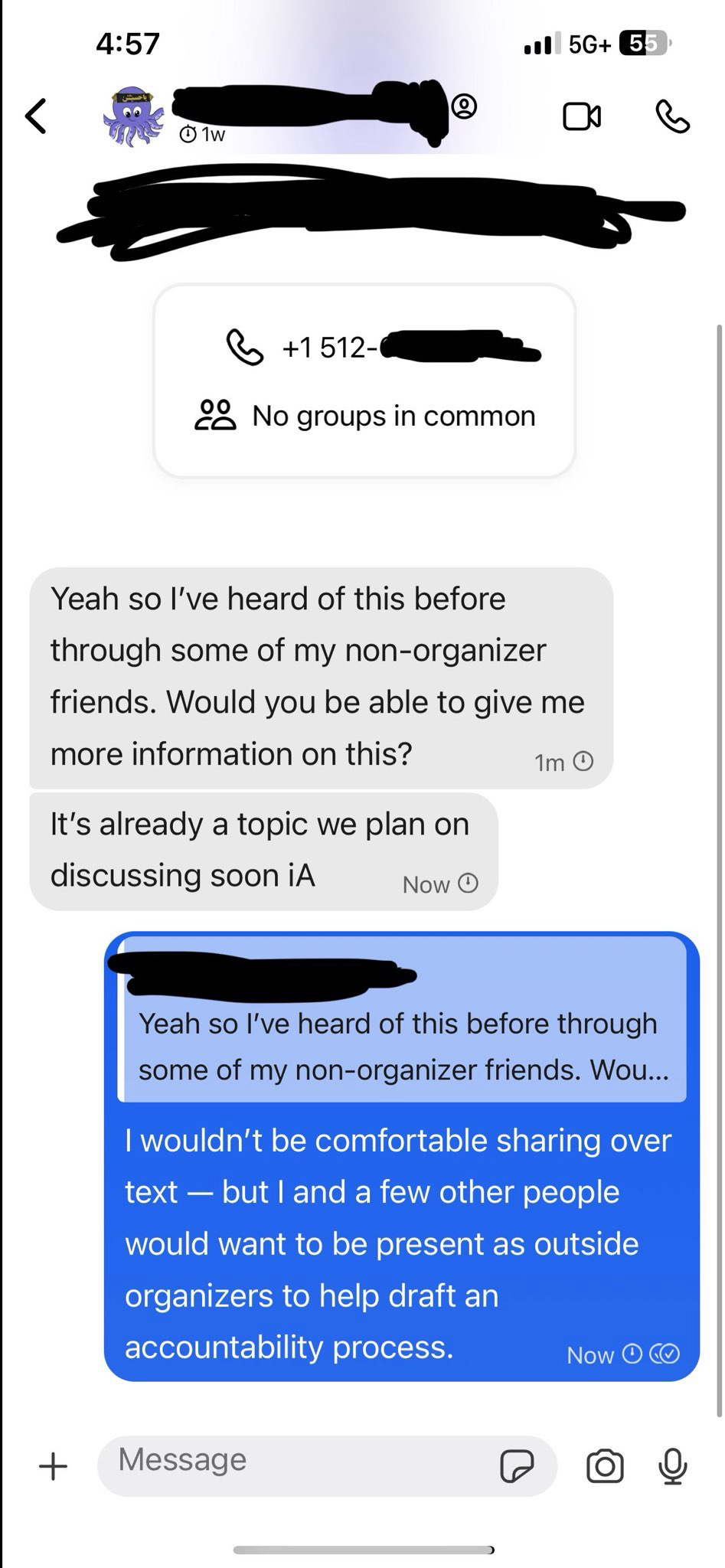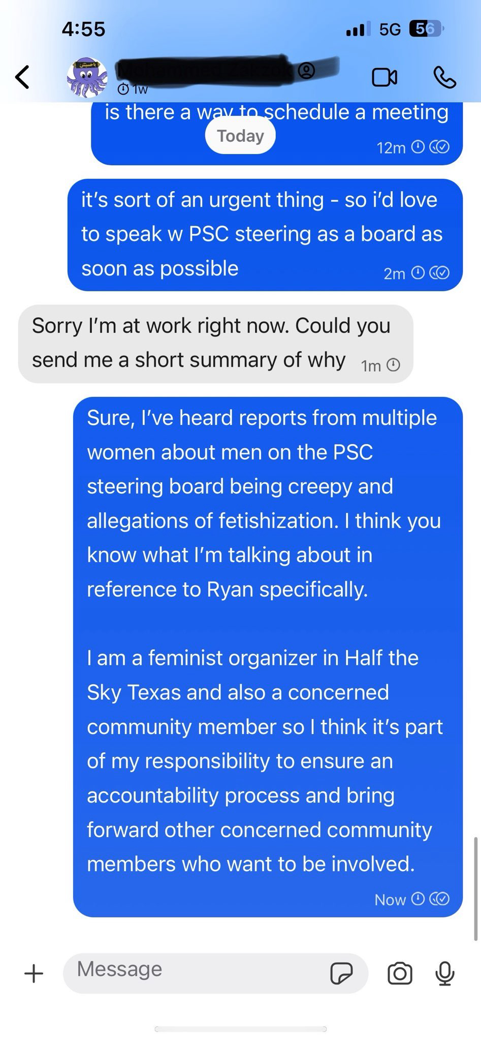With that being said, I do have some evidence in relation to PSC internally acknowledging that Ryan exhibited predatory behavior, and then as the past month has shown, have done nothing. Since Austin organizing leadership is so quick to condemn, to gaslight, to act as if I never did anything -- here is some evidence that I did begin a process for accountability.